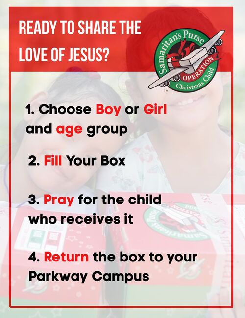 Operation Christmas Child Shoeboxes can be dropped off at Parkway Lone Tree before or after Sunday morning service or Wednesday night Groups.